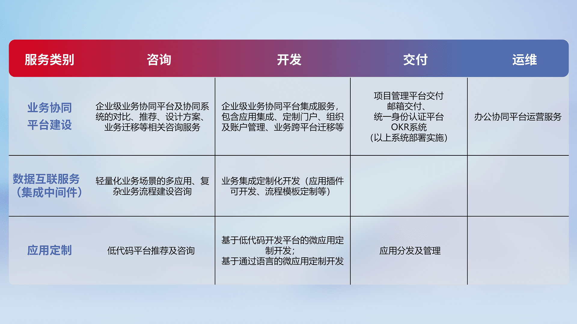 针对钉钉、、、、企微、、、IDaas等平台级产品提供产品的规划、、、方案、、、交付、、定制化开发等服务,,,实现如统一协同办公、、、智能客户服务、、、、混合会议管理、、智能数据查询、、、、等业务场景,,,,实现数字化转型。。。。